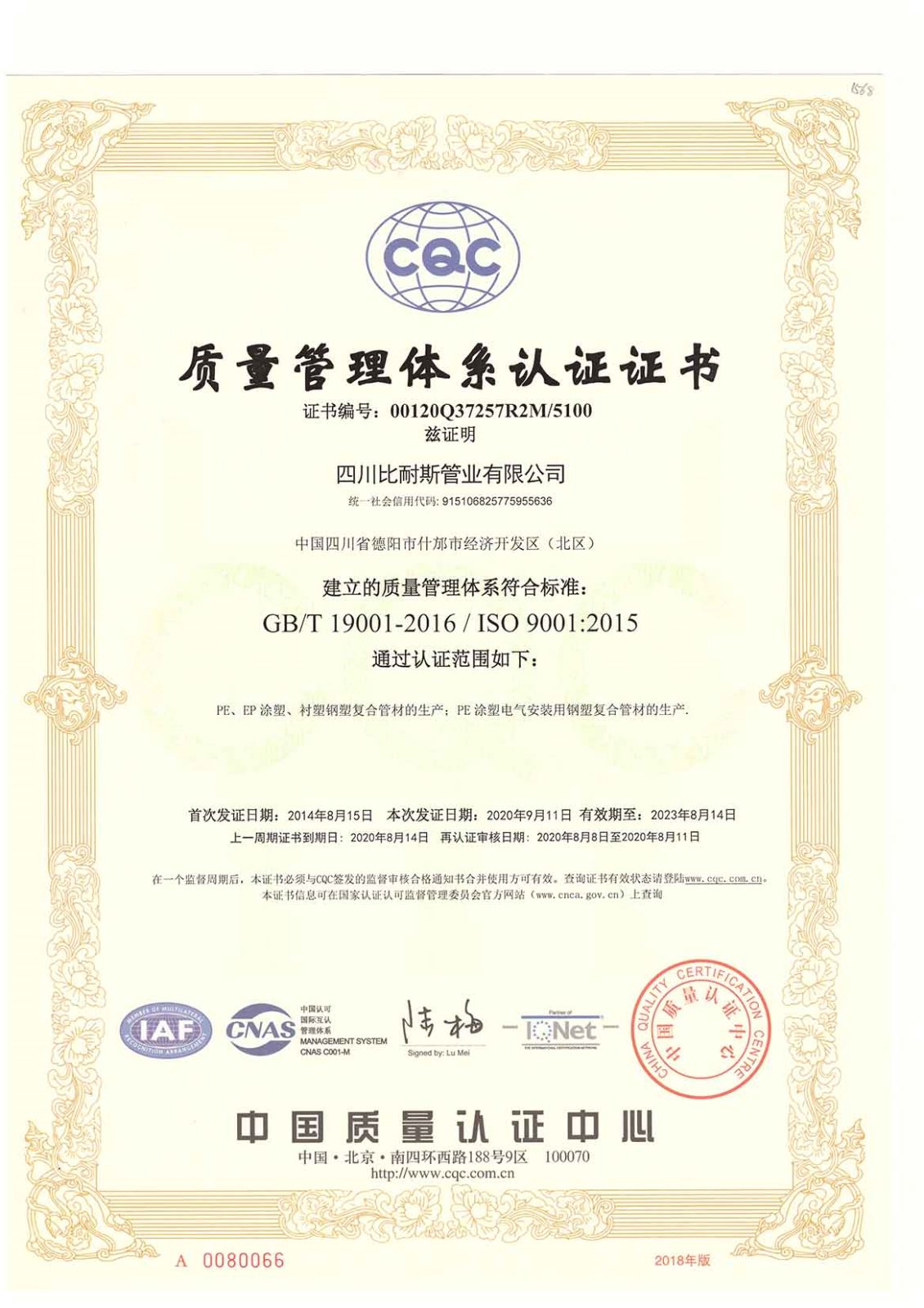 质量管理体系认证证书